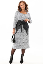 Платье женское полуприлегающего силуэта, длиной ниже колена на 10см предназначено для повседневной носки. Лиф платья отлетной, перед с двумя нагрудными вытачками, спинка цельнокроенная. Лиф платья на подкладке, к которой крепится нижняя часть платья. Переднее полотнище с карманами в боковых швах, заднее с двумя талиевыми вытачками. Горловина круглая, обтачная, без воротника. Рукав втачной, длиной 3/4, одно шовный. Платье с плечевыми накладками. Длина спинки 112см. Длина рукава 43см