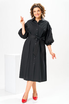 Платье женское относится к нарядной торжественной одежде. Платье женское прямого силуэта, длиной до нижней части икры. Перед с 2-мя нагрудными вытачками. Спинка с отрезной кокеткой с фигурным обтачным разрезом, фиксирующимся по горловине на 2-е обточные завязки. Горловина круглая, обтачная, без воротника. Рукав втачной, одношовный, длиной 3/4 с фигурным низом с 14-ю односторонними складками (по 7 с каждой стороны от угла манжеты), с притачной манжетой из отделочной ткани. Боковые швы с разрезами. Платье на подкладке. Платье без плечевых накладок.
