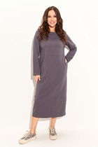 Платье женское, для повседневной носки. Платье слегка расширенное к низу, длиной до нижней части икры. Перед с фигурным подрезом по линии талии и вертикальными приточными планками, верхняя часть с 2-мя нагрудными вытачками; нижняя часть с 4-мя односторонними складками (по 2-е с каждой стороны) зафиксированными отделочными строчками. Спинка отрезная по линии талии. Низ платья с приточным воланом. Горловина круглая обточная, без воротника. Застёжка центральная на 10-ть вертикально обмётанных петель и 10-ть пришивных пуговиц. Рукав втачной, короткий, одношовный с притачным воланом. Платье с плечевыми накладками. Длина спинки 127 см, длина рукава 31 см.