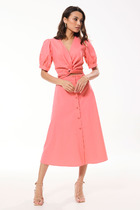 Платье женское, относится к нарядной торжественной одежде. Платье женское  полу прилегающего силуэта, длиной за колено, выполнено в виде имитации костюма. Лиф платья отлетной. Перед с 2-мя отрезными бочками, левый бочок с отделочным фигурным поясом, декорированным объёмным украшением, шов притачивания левого бочка с разрезом с закруглёнными концами. Спинка лифа со средним швом и 2-мя отрезными бочками. Лиф платья на подкладке, к которой крепится нижняя часть платья (юбка). Переднее полотнище нижней части с 2-мя таллиевыми вытачками. Заднее полотнище с 2-мя таллиевыми вытачками и средним швом, заканчивающимся шлицей. Нижняя часть платья на подкладке. Горловина круглая, обтачная, без воротника. Застёжка на потайную тесьму-молнию в среднем шве спинки. Рукав втачной, одно шовный, длиной 3/4. Низ рукава со встречной складкой, обточной, складка декорирована пришивной пуговицей. Платье с плечевыми накладками. Длина спинки 104 см, длина рукава 42 см.