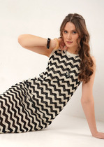 Платье женское, относится к нарядной торжественной одежде. Платье женское полу прилегающего силуэта, длиной за колено, выполнено в виде имитации костюма. Лиф платья отлетной. Перед с 2-мя отрезными бочками, левый бочок с отделочным фигурным поясом, декорированным объёмным украшением, шов притачивания левого бочка с разрезом с закруглёнными концами. Спинка лифа со средним швом и 2-мя отрезными бочками. Лиф платья на подкладке, к которой крепится нижняя часть платья (юбка). Переднее полотнище нижней части с 2-мя таллиевыми вытачками. Заднее полотнище с 2-мя таллиевыми вытачками и средним швом, заканчивающимся шлицей. Нижняя часть платья на подкладке. Горловина круглая, обтачная, без воротника. Застёжка на потайную тесьму-молнию в среднем шве спинки. Рукав втачной, одно шовный, длиной 3/4. Низ рукава со встречной складкой, обточной, складка декорирована пришивной пуговицей. Платье с плечевыми накладками. Длина спинки 104 см, длина рукава 42 см.