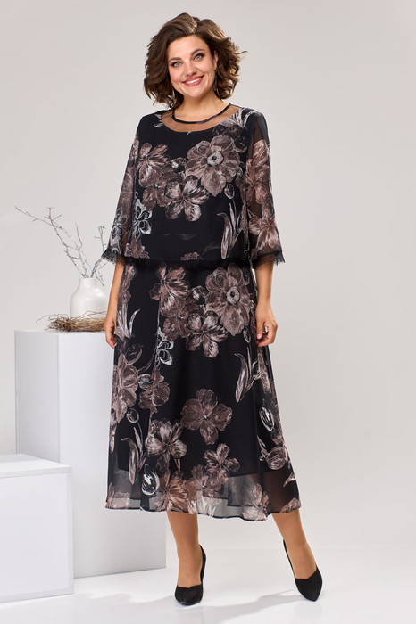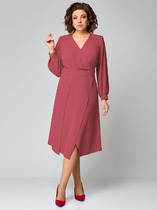 Платье женское, отрезное по линии талии, расширенное к низу, длиной до середины икры. Верхняя часть переда с 2-мя нагрудными выточками, отлётная, низ декорирован настрочным кружевом. Нижняя часть переда цельнокроеная. Верхняя часть спинки отлётная, низ декорирован надстрочным кружевом, нижняя - цельнокроеная. Горловина круглая, с втачной планкой из отделочной ткани по переду. Горловина с разрезом "капелькой" на спинке. Горловина и разрез обработаны косой бейкой, разрез фиксируется на 1-ну навесную петлю и 1-ну пришивную пуговицу. Рукав втачной, одно шовный, длиной 3/4 с притачным кружевом по низу. Платье на подкладке. Платье с плечевыми накладками.