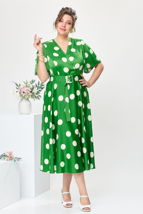 Платье женское, относится к торжественной одежде. Платье женское, отрезное по линии талии, расширенное к низу. Верхняя часть переда с 2-мя отрезными бочками, нижняя без конструктивных особенностей. Верхняя часть спинки со средним швом и 2-мя таллиевыми вытачками, нижняя без конструктивных особенностей. Горловина с V-образным вырезом, с запахом, обтачная без воротника. Застёжка на потайную тесьму-молнию в левом боковом шве платья. Рукав втачной, одно шовный, расширенный к низу, 2-мя односторонними складками по окату, рукав короткий. Платье с плечевыми накладками. К платью прилагается съёмный пояс с застёжкой на пряжку и пробивные блочки.