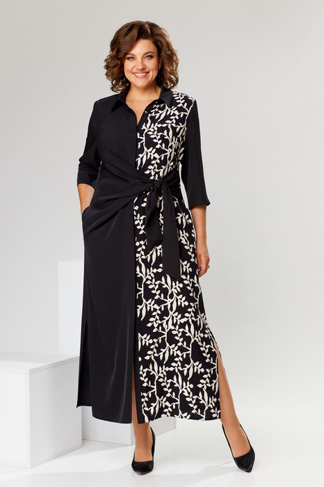 Платье женское предназначено для повседневной носки. Платье женское полу прилегающего силуэта, длиной до нижней части икры. Правая часть переда с конструктивным подрезом, формирующим запах, с притачным поясом; левая часть переда из отделочной ткани с 1-ной нагрудной вытачкой и притачной вертикальной планкой. Спинка со средним швом, 2-мя таллиевыми вытачками, левая часть спинки из отделочной ткани. Боковые швы с карманами, внизу с разрезами в левом боковом шве закреплён пояс. Горловина круглая с втачным воротником рубашечного типа с отрезной стойкой. Застёжка центральная потайная на 8-мь вертикально обмётанных петель и 8-мь пришивных пуговиц. Рукав втачной 2-х шовный, длиной 3/4, локтевой шов с разрезом. Платье с плечевыми накладками. Длина спинки платья 131 см, длина рукава 43 см.