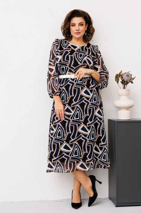 Платье женское отрезное по линии талии, расширенное к низу, длиной до середины икры. Верхняя часть переда с 2-мя нагрудными вытачками, нижняя цельнокроеная. Верхняя часть спинки с 2-мя таллиевыми вытачками, с обтачным разрезом по центру, фиксирующимся по горловине на 1-ну навесную петлю и 1-ну пришивную пуговицу; нижняя часть с 2-мя таллиевыми вытачками. Горловина круглая обточная, без воротника. Застёжка на потайную тесьму-молнию в левом боковом шве платья. Рукав втачной, одно шовный, по окату с лёгкой сборкой, длиной 7/8, низ собран на эластичную тесьму. Платье на подкладке. Платье без плечевых накладок. К платью прилагается отдельный ремень. Длина спинки платья 120 см, длина рукава 56 см.