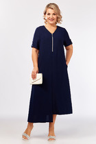 Платье женское отрезное по линии талии, расширенное к низу, длиной до середины икры. Верхняя часть переда с 2-мя нагрудными вытачками, нижняя цельнокроеная. Верхняя часть спинки с 2-мя таллиевыми вытачками, с обтачным разрезом по центру, фиксирующимся по горловине на 1-ну навесную петлю и 1-ну пришивную пуговицу; нижняя часть с 2-мя таллиевыми вытачками. Горловина круглая обточная, без воротника. Застёжка на потайную тесьму-молнию в левом боковом шве платья. Рукав втачной, одно шовный, по окату с лёгкой сборкой, длиной 7/8, низ собран на эластичную тесьму. Платье на подкладке. Платье без плечевых накладок. К платью прилагается отдельный ремень. Длина спинки платья 120 см, длина рукава 56 см.