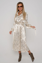 Платье женское предназначено для повседневной носки. Платье женское, полу прилегающего силуэта, длиной за колено. Перед с2-мя нагрудными вытачками и средним швом. Спинка с 2-мя таллиевыми вытачками средним швом. Платье с отрезными бочками. Горловина фигурная. Срезы горловины переда, среднего шва переда, низа платья, боковые швы переда и спинки обработаны косой бейкой из отделочной ткани, ширина бейки 1,2 см. Вырез горловины декорирован пришивным бантом из отделочной ткани и пришивной стразой. Низ платья фигурный. Рукав втачной, одно шовный, длиной 7/8. Платье с плечевыми накладками.
