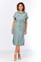 Платье женское, предназначено для повседневной носки. Платье женское отрезное по линии талии, слегка расширенное к низу, длиной до серединны икры. Верхняя часть переда с 2-мя нагрудными вытачками, с 2-мя вертикальными притачными планками, с 7-мью декоративными защипами шириной 0,3 см (с каждой стороны; нижняя часть переда с лёгкой сборкой по верхнему срезу по бокам). Верхняя часть спинки цельнокроеная; нижняя часть спинки с лёгкой сборкой по верхнему срезу. Платье с втачным поясом по линии талии с обработанной по ним кулисой с завязками с металлическими наконечниками. Горловина круглая с втачной стойкой. Застёжка центральная на верхней части переда на 5-ть вертикально обмётанных петель и 5-ть пришивных пуговиц. Рукав втачной, одно шовный длинный со сборкой и притачной манжетой, с застёжкой на обмётанную петлю и пришивную пуговицу. Платье на подкладке. Платье с плечевыми накладками. Длина спинки платья 126 см. Длина рукава 59 см.
