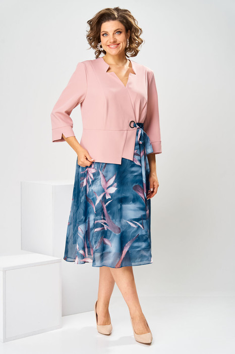 Платье женское относится к нарядной торжественной одежде, но может использовано и при повседневной носке. Платье женское, отрезное по линии талии, расширенное к низу, длиной за колено. Верхняя часть переда с отрезными рельефами, выходящими из плечевых швов, центральная часть с зафиксированным запахом. Верхняя часть спинки со средним швом и 2-мя рельефами, выходящими из плечевых швов. Горловина с V-образным вырезом, фигурная, обточная без воротника. Нижняя часть переда и нижняя часть спинки цельнокроеные, выполнены из отделочной ткани. Шов соединения верхней и нижней частей платья декорирован притачной фигурной отлетной баской. Платье с декоративным поясом из отделочной ткани, закреплённом на левом боковом шве и фиксирующимся в бант через металлическую пробивную блочку на центральной части переда. Рукав одно шовный втачной, длиной до локтя, с притачной фигурной манжетой. Платье с плечевыми накладками. Нижняя часть на подкладке. Длина платья 112 см, длина рукава 33 см.