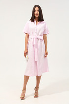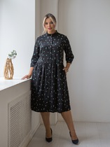 Платье женское относится к нарядной торжественной одежде, но может использовано и при повседневной носке. Платье женское, отрезное по линии талии, расширенное к низу, длиной за колено. Верхняя часть переда с отрезными рельефами, выходящими из плечевых швов, центральная часть с зафиксированным запахом. Верхняя часть спинки со средним швом и 2-мя рельефами, выходящими из плечевых швов. Горловина с V-образным вырезом, фигурная, обточная без воротника. Нижняя часть переда и нижняя часть спинки цельнокроеные, выполнены из отделочной ткани. Шов соединения верхней и нижней частей платья декорирован притачной фигурной отлетной баской. Платье с декоративным поясом из отделочной ткани, закреплённом на левом боковом шве и фиксирующимся в бант через металлическую пробивную блочку на центральной части переда. Рукав одно шовный втачной, длиной до локтя, с притачной фигурной манжетой. Платье с плечевыми накладками. Нижняя часть на подкладке. Длина платья 112 см, длина рукава 33 см.