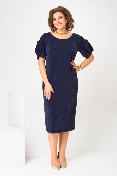 Платье женское, предназначено к нарядной торжественной одежде. Платье женское, полу прилегающего силуэта, длиной ниже колен. Перед с 2-мя нагрудными вытачками. Спинка с 2-мя таллиевыми вытачками, со средним швом, заканчивающимся шлицей. Горловина круглая, обточная, без воротника. Застёжка на потайную тесьму молнию в среднем шве спинки. Рукав втачной одно шовный, короткий, с обтачным низом, на подкладке. Рукав декоррирован цветком. Платье на подкладке. Платье с плечевыми накладками. Длина платья по спинке 110 см, длина рукава 26 см.