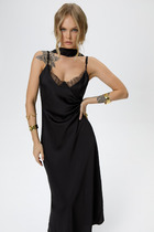 Платье из легкой плательной ткани. Платье отрезное по линии талии. По горловине переда и спинки - притачная планка. Легкая сборка от горловины по переду и по линии талии добавляет объема и воздушности. Рукава - легкие крылышки. Юбка-клеш, длинная. Застежка-молния - в боковом шве платья. Пояс в комплектацию не входит.