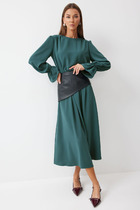 Платье полуприлегающего силуэта с коротким втачным рукавом. По линии груди вытачки. Спинка платья со средним швом и застежкой на воздушную петлю и пуговицу. По низу платья односторонние складки. По низу рукавов и шву притачивания складок кружево.