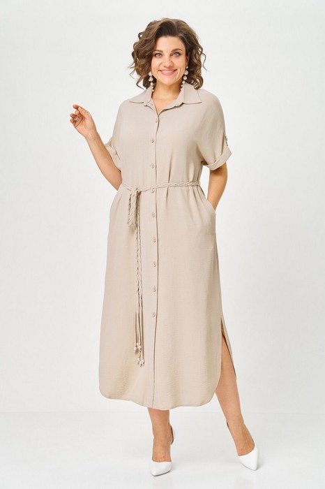 Платье женское прямого силуэта со спущенной линией плеча.   Застежка центральная на 8 петель и пуговиц. Воротник отложной на стойке. По верхней части спинки кокетка, нижняя часть спинки со встречной складкой. В боковых швах карманы. По линии талии пояс в тон ткани. Низ рукава  с манжетой и декоративной патой. Платье с фигурной линией низа и разрезами.