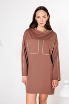 Платье женское свободного силуэта, с втачным рукавом. Перед с нагрудными выточками. Спинка с застежкой на молнию в среднем шве. Горловина круглой формы, декорирована отложным воротником. Изюминка платья – волнообразные рукава с разрезом, по низу на притачной манжете, с застежкой на петли и пуговицы.