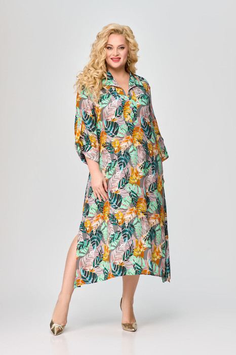 Платье А-силуэта с втачным рукавом. По горловине отложной воротник и планка с декоративными пуговицами. Спинка со средним швом. Рукав с притачной манжетой, фиксируется патой. В боковых швах карманы. Низ платья фигурный, с разрезами.