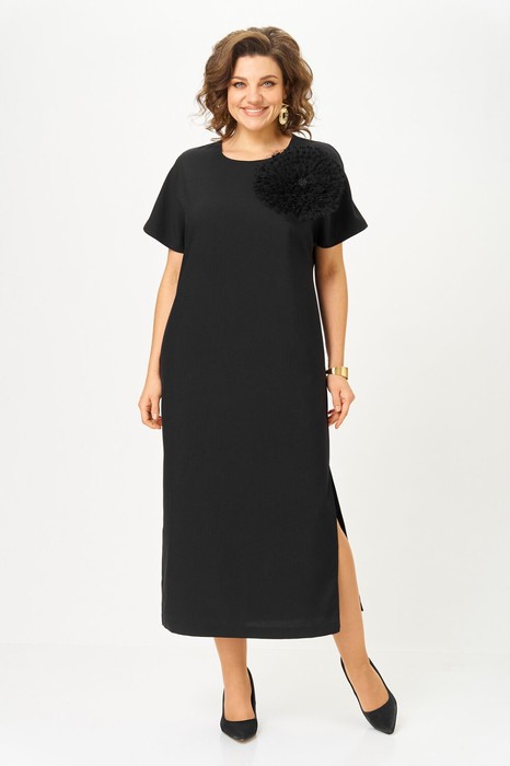 Платье женское прямого кроя, с коротким цельнокроеным рукавом.  Вырез горловины округлой формы. В среднем шве спинки застежка молния. В боковых швах обработаны карманы и разрезы. В комплекте с платьем съемное украшение в виде цветка.