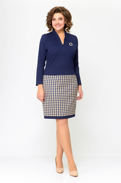 Платье отрезное ниже линии талии. Верхняя часть выполнена из однотонного полотна, нижняя часть – с дизайном «гусиная лапка».