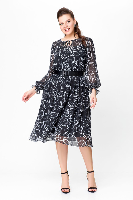 Платье длиной миди, выполнено из шифона на трикотажной подкладке.  Лиф отрезной по линии талии. Талия регулируется резинкой. Нижняя часть платья А-силуэта.  Подкладка верхней части платья на бретелях. Рукав длинный втачной. По низу рукава - 5 рядов декоративных, эластичных строчек. Горловина округлой формы, по центру переда капелька с завязкой.