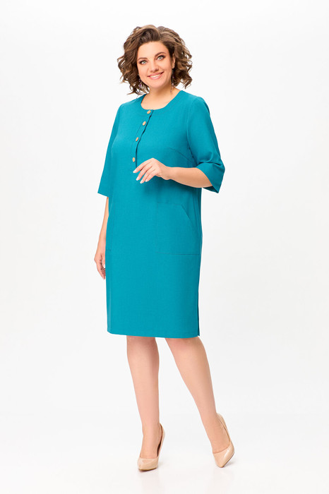Платье прямого силуэта из  вискозно-льняной ткани, полочка с планкой , застегивающейся на петли и декоративные пуговицы, с нагрудными выточками и накладными фигурными  карманами в области бёдер, горловина круглая, обработана притачной  обтачкой, рукав втачной, одношовный, длиной ниже локтя. В боковых швах разрезы длиной 20 см.