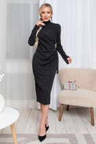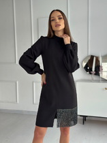 Платье-рубашка из лёгкой вискозной ткани, свободного кроя А-силуэта. Застёжка центральная на петли и декоративные пуговицы. Полочка с нагрудными вытачками, спинка цельная. Воротник рубашечного типа, отложной со стойкой. Пройма спущенная с отложной манжетой. В боковых швах обработаны карманы.