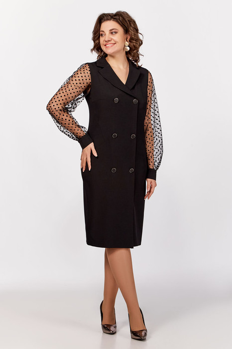 Нарядное платье из поливискозной ткани, полуприлегающего силуэта. Спереди имитация двубортной застёжки с декоративными пуговицами в два ряда. Полочки с фигурными бочками и нагрудными выточками. Спинка с центральным швом и талиевыми выточками. Горловина V-образной формы с отложными лацканами и воротником пиджачного типа. Рукав втачной длинный из отделочной ткани «сетка», по низу со сборкой и манжетой из основной ткани, застёгивающейся на петлю и декоративную пуговицу. В боковом шве застёжка на потайную тесьму-молнию.