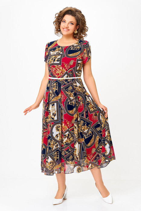 Платье из шифона на трикотажной подкладке, Х-образного силуэта с полуприлегающим лифом. Платье отрезное по линии талии. По переду лифа расположены рельефы, по спинке лифа талиевые выточки. Юбка расклешенная из шести клиньев со встречными складками по линии талии. В среднем шве спинки предусмотрена потайная тесьма- молния. Рукав втачной покроя тюльпан, длина рукава 15 см.