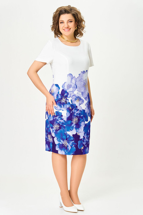 Платье полуприлегающего силуэта из мягкой поливискозной ткани с оригинальным дизайнерским принтом. По полочке выполнены рельефные швы, по спинке рельефные швы, средний шов со шлицей и застёжкой на потайную тесьму-молнию. Горловина круглая, обработана обтачкой. Рукав втачной, короткий.