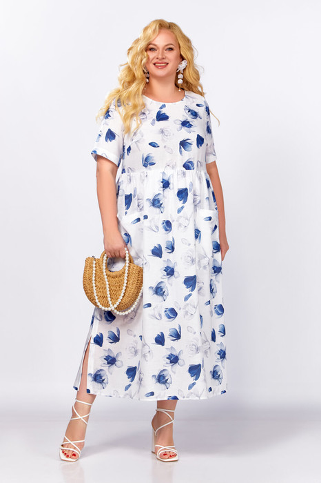 Платье из вискозно-льняной ткани с оригинальным принтом прямого силуэта длиной миди. Платье с отрезной, слегка завышенной линией талии и сборкой по юбке.