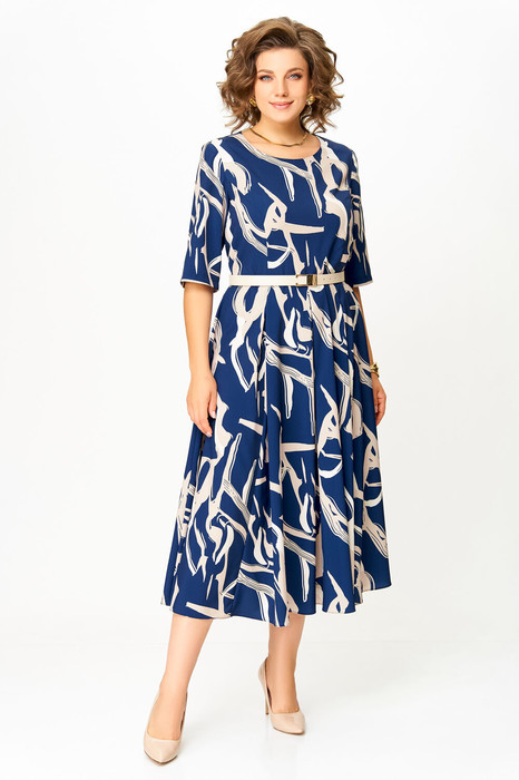 Платье из мягкой струящейся вискозной ткани  Х-образного силуэта с полуприлегающим лифом. Платье отрезное по линии талии. По переду лифа расположены рельефы, по спинке лифа - талиевые выточки. Юбка расклешенная из шести клиньев со встречными складками по линии талии. В среднем шве спинки предусмотрена молния. Рукав втачной длиной 3/4.