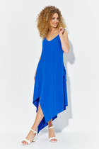 Платье женское, полуприлегающего силуэта с коротким рукавом. Рукав типа "фонарик" со сборкой сверху и снизу. По низу притачная манжета. По переду нагрудные вытачки. Горловина круглой формы. По низу ассиметричная, отлетная планка с разрезом и декоративная нашивка. По спинке средний шов с разрезом снизу и талевые вытачки. Горизонтальный подрез выше линии талии. Верхняя часть спинки и рукав выполнены из ткани сетка с флоковым нанесением. Застежка на потайную "молнию"