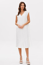 Платье женское, прямого силуэта с коротким цельнокройным рукавом. По низу рукава манжета. Вырез горловины У-образной формы. По центру переда, от горловины мягкая складка. В боковых швах функциональные карманы с отделочной строчкой имитирующей накладной карман. По спинке отрезная кокетка, средний шов и мягкая, встречная складка по центру с отделочной нашивкой.