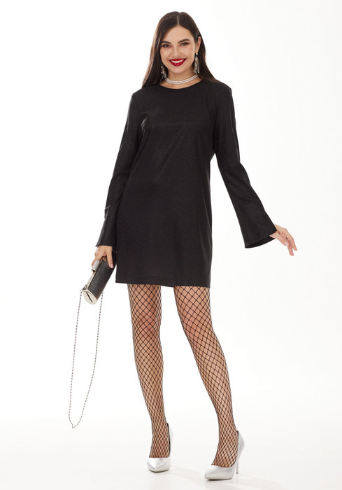 Платье женское, прямого силуэта, длинной мини. Выполнено из трикотажного полотна с блеском. По переду расположены нагрудные вытачки, идущие из бокового шва. Спинка с удлиненной капелькой-разрезом до уровня талии. Горловина округлой формы, с застёжкой по спинке на навесную петельку с пуговицей. Рукав втачной длинный, расширенный к низу, с разрезом в верхнем шве.
