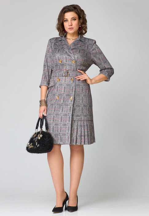 Платье женское полуприлегающего силуэта, выполненное из поливискозы плательной группы. Платье с двухбортной застежкой на петли-пуговицы. Горловина оформлена воротником пиджачного типа. Рукава двушовные, длиной 3/4, по низу обработаны притачной манжетой. По спинке - средний шов и талиевые выточки. По переду расположены нагрудные выточки. В левой боковой части переда вставлена отделочная деталь со складками, направленными к центру, над которой горизонтально расположена пата. В комплект к платью входит пояс из основной ткани с декоративной пряжкой, в цвет фурнитуры.