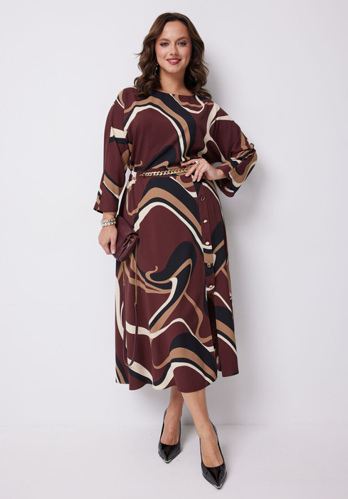 Стильное платье А-силуэта, выполненное из вискозы с оригинальным принтом. Платье отрезное по линии талии. Верхняя часть переда платья с круглой горловиной, спинка - со средним швом и капелькой, застегивающейся на навесную петлю и пуговицу. Рукав цельнокроенный, длиной 7/8. Нижняя часть платья покроя полусолнце. На одной из сторон юбки переда обработана отделочная планка с декоративными пуговицами, внизу - разрез. В боковых швах в области бедер обработаны карманы. В центральной части переда в области талии - притачной пояс со съемной декоративной цепью, которая изящно подчеркивает линию талии. По боковым швам и спинке пояса вставлена широкая резинка.