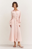 Элегантное платье полуприлегающего силуэта с асимметричной застежкой на петли и пуговицы. Перед платья с нагрудными вытачками и клапанами в области бёдер. Спинка с талиевыми вытачками и средним швом, внизу которого обработана шлица. Застежка асимметричная, двубортная, по низу платья расходится на разрез. В области плеч — погоны, закрепляющиеся на пуговицу. Рукава двухшовные втачные, длиной 3/4, с притачной манжетой. Платье с плечевыми накладками и со съёмным ремнем в цвет фурнитуры. Фурнитура и комплектующие (ремень) могут незначительно отличаться от представленных на фото.