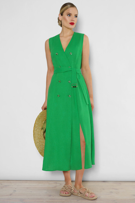 Это платье - настоящее воплощение легкости и свободы. Изготовленное из тонкой льняной ткани, оно идеально подходит для жарких летних дней. Это платье создано для того, чтобы вы могли наслаждаться летом с комфортом. Платье женское полуприлегающего силуэта для повседневной носки в летний период. Перед со смещенной застежкой на 3 петли и пуговицы, остальные пуговицы несут декоративную функцию (размер и цвет фурнитуры может незначительно отличаться от фото), длиной миди. В комплект к платью идет съемный пояс. В боковых швах обработаны карманы.