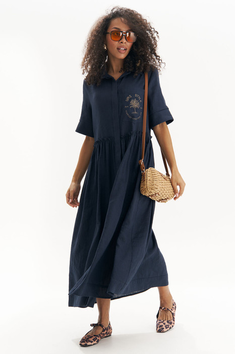 Льняное платье свободного кроя в насыщенном тёмно-синем оттенке — идеальный спутник для городских прогулок и отпускных маршрутов. Мягко драпирующаяся ткань дарит ощущение лёгкости и свободы, а вышивка с пальмой и надписью "Everyday Luxury from URS" добавляет экзотическую нотку и подчёркивает расслабленный шик.