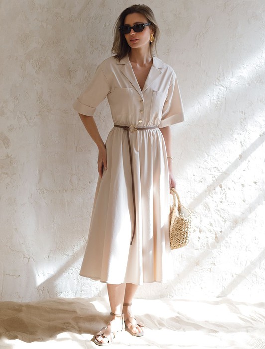 Состав: 97%Хлопок 3%ПУПлатье в стиле сафари выполнено из хлопкового твила. Изделие дополнено тонким ремешком из эко-кожи, боковыми и нагрудными карманами, подворотами на рукавах. Застежка на пуговицы спереди. Благодаря наличию эластана в составе изделие сохранит свой безупречный внешний вид в течение долгого времени. Обладает высокой воздухопроницаемостью, в платье будет комфортно даже в жаркое время года.