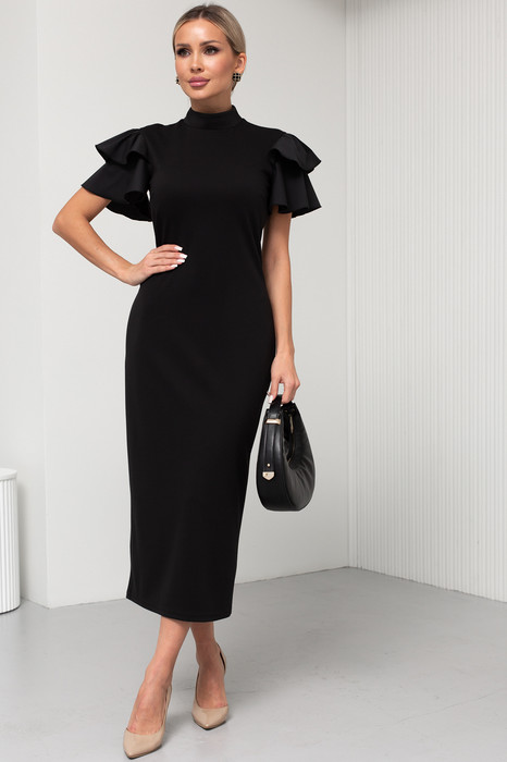 Элегантное платье прилегающего силуэта выполнено из однотонного трикотажного полотна. Горловина оформлена воротником - стойка. По среднему шву спинки застежка на потайную ленту - молнию. Короткие рукава - крылышки выполнены из хлопка. Низ ровный, сзади разрез.