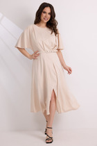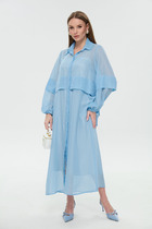 Платье с отрезной линией по талии из джинсовой ткани. Длина миди. Платье на регулируемых бретелях. Застёжка по переду на кнопки и по боку на потайную молнию. По переду клапаны на полочке и на юбке. По талии платье фиксируется съёмным регулируемым поясом на пряжке.