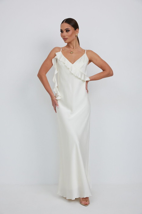 Платье из атласной ткани полуприлегающего силуэта на регулируемых бретелях длины «макси» слегка расширенное к низу. Перед с декоративным воланом. Платье на подкладке. Длина 120 см.