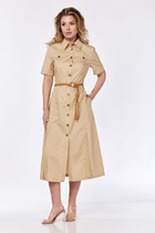 Платье полуприлегающего силуэта. По переду под грудью подрез фигурной формы, нагрудные вытачки, низ платья выполнен в гладкой однотонной ткани, за счет цвета и силуэта скрывающей все недостатки фигуры. Спинка со средним швом и шлицей, сверху с застежкой каплей и двумя пуговицами, подрез. Воротник втачной на стойке с декоративными разрезами со стороны плеч. В комплекте съёмное декоративное украшение. Рукав втачной с манжетой на завязках. Обращаем Ваше внимание, что фурнитура может отличаться от фото. Длина платья от высшей точки плечевого шва до низа 107 см (р 48-52), 109 см (р 54-58). Длина рукава 60 см.