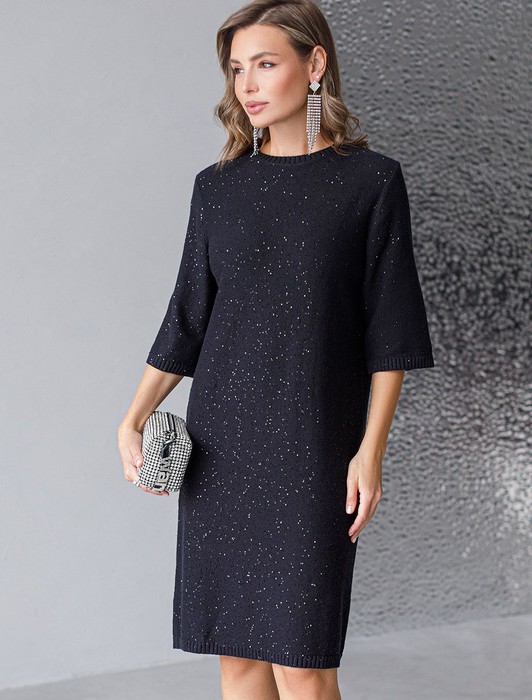 Состав: 90%Хлопок 10%ПЭ Плотность: 5 GGЭффектное платье черного цвета с широкими рукавами средней длины выполнено из хлопковой пряжи с вкраплением сияющих пайеток, что придает особую изысканность. Платье связано изнанкой, пряжа отличается легкостью и приятной текстурой, совершенно не колется, обеспечивает комфорт даже при длительном использовании, а натуральные волокна поддерживают оптимальный температурный баланс. Крой полуприлегающий, подчеркивает женственный силуэт, а круглый ворот, манжеты на рукавах и по низу гармонично завершают дизайн, создающий аккуратный образ. Благодаря универсальному крою, платье подойдет девушкам и женщинам пышных форм и больших размеров, длина миди подходит на низкий и высокий рост. Мерцающее полотно добавляет особого шарма вашему образу, делая его уместным как на праздник, так и для повседневного выхода. Новый год, вечеринка или любое другое мероприятие пройдут ярко — сияющие пайетки создают ощущение праздника в каждом движении. Это стильное платье поможет чувствовать себя уверенно на любом мероприятии в осенний и зимний сезон.
