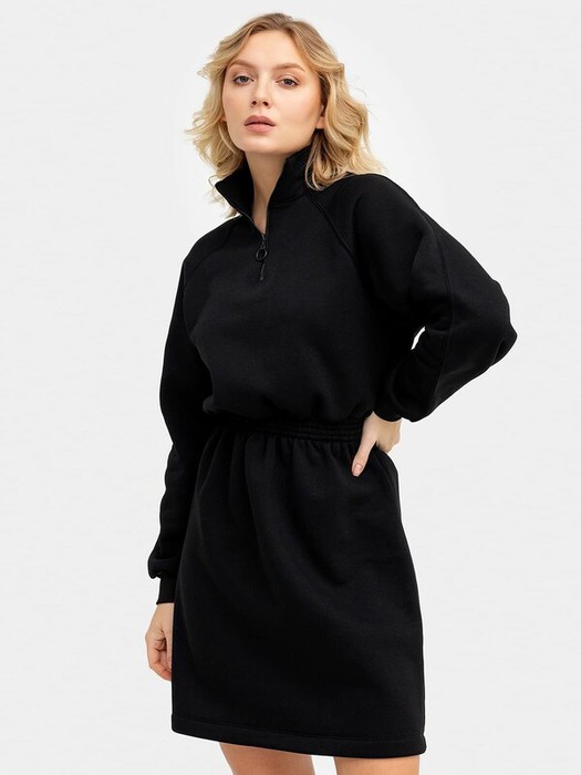 Стильное женское платье длины мини из нежного и приятного к телу трикотажного футера. Силуэт свободный, вырез круглый, с воротником-стойкой. Рукава длинные и объемные, на манжетах. По шее проходит вертикальная застежка-молния. Эластичная тесьма в поясе с декоративными строчками акцентирует внимание на талии.