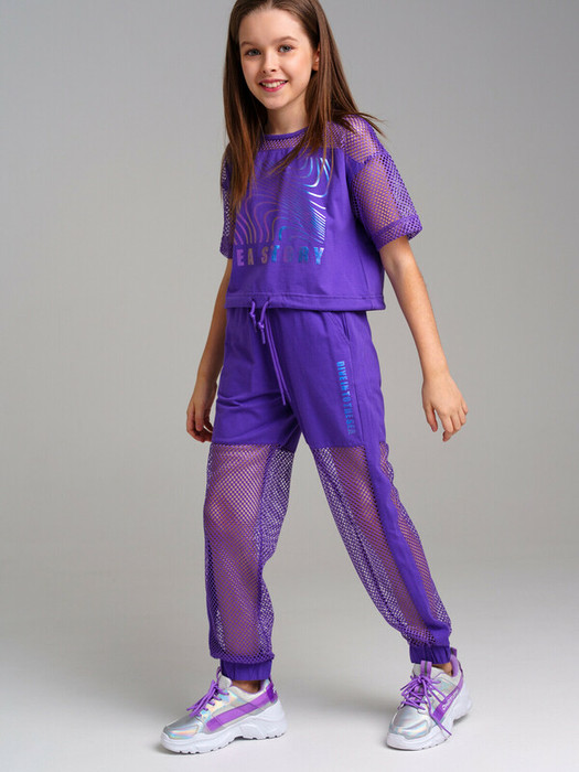 Брюки из трикотажа и сетки. Эластичный пояс со шнурком. Боковые карманы. По низу штанин внутренняя резинка.
