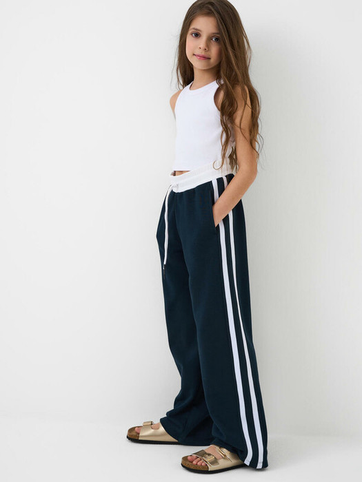 Широкие брюки на резинке для девочки подростка. Выполнены из мягкого хлопкового трикотажа футер без начеса. Для удобства и регулировки талии предусмотрен шнур. По бокам расположены карманы. Декоративные лампасы по бокам.