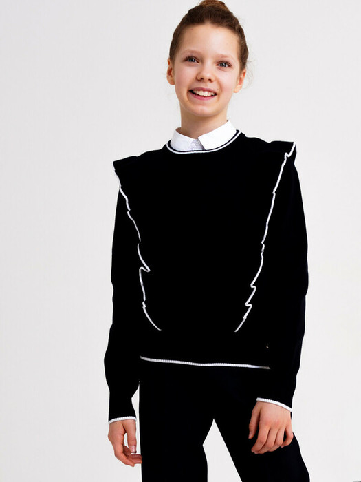 Классический синий школьный кардиган для девочки подростка. Кардиган прямого силуэта на пуговицах выполнен из вязаного трикотажа с высоким содержанием хлопка. Кофта в школу выглядит стильно, благодаря лаконичному дизайну и декору из рюш. Рубашка, футболка или поло + кардиган для школьницы составят красивый элегантный комплект для школы.