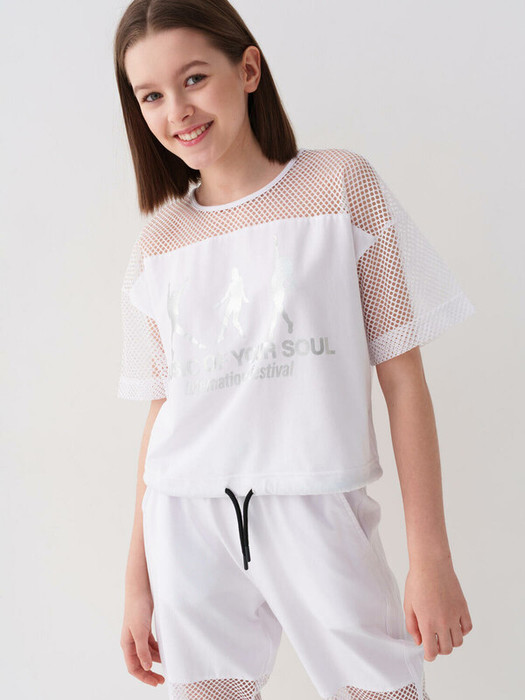 Футболка оверсайз для девочки подростка. Модель выполнена из эластичного хлопкового трикотажа джерси. Рукава и верхняя часть выполнены из сетки. На груди расположен крупный принт. Горловина круглая. В нижней части — шнурок для регулировки посадки.