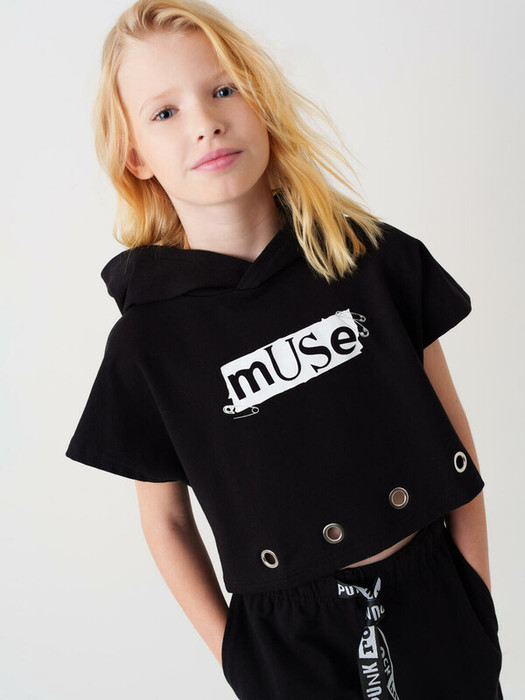 Футболка оверсайз с капюшоном для девочки подростка. Модель укороченная, выполнена из эластичного хлопкового трикотажа футер. На груди расположен крупный принт. По низу декоративные вырезы с металлическими кольцами.